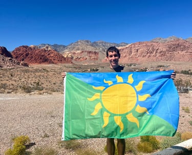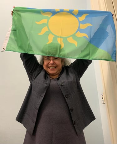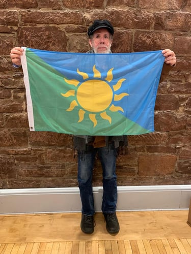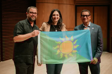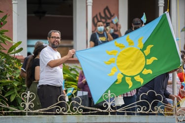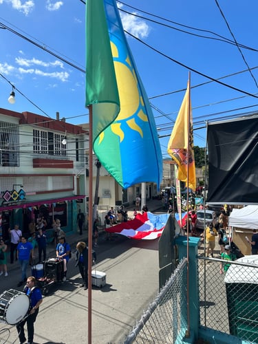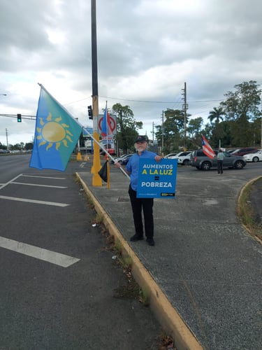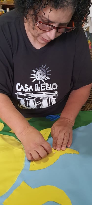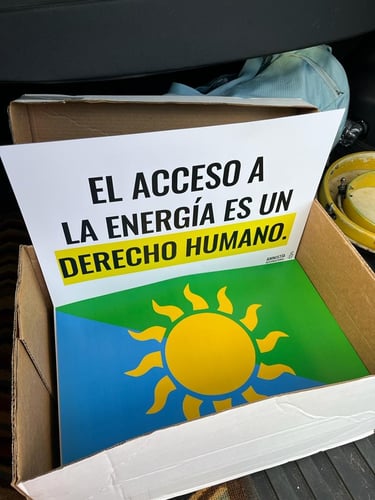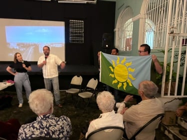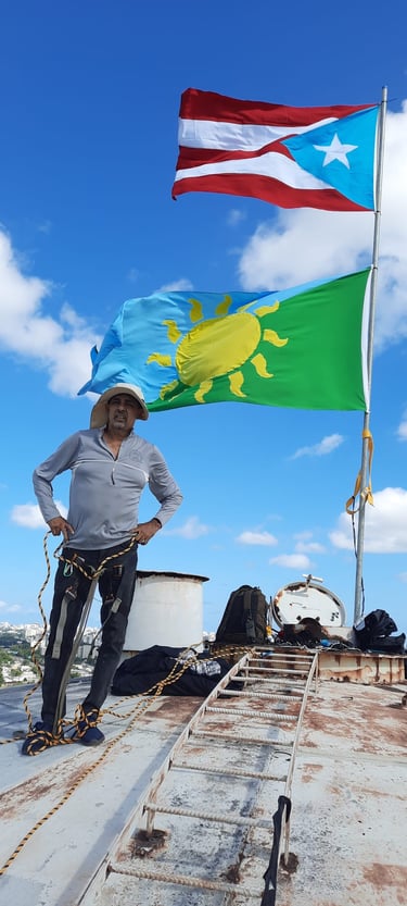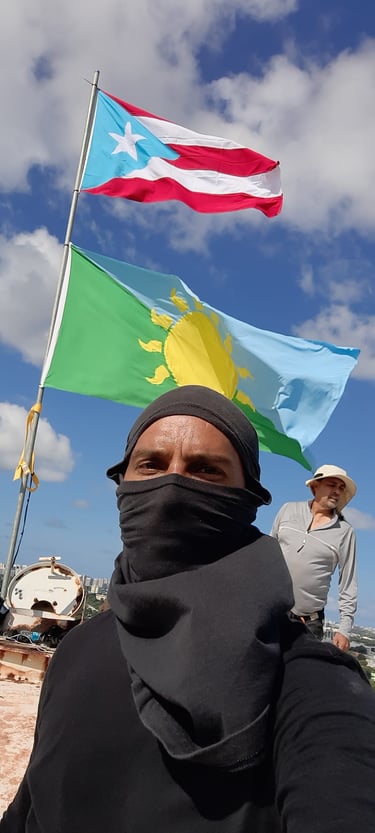 La ruta de la insurrección solar está marcada y es más urgente que nunca. A días del embate del huracán Fiona y a cinco años del paso de María, el 20 de septiembre de 2022, en una ceremonia comunitaria frente a la sede de Casa Pueblo, fue izada una nueva insignia propia diseñada con contribuciones de Javier A. Hernández y la artista adjunteña Verónica Aponte. La nueva insignia solar tiene dos triángulos, uno azul-violeta para representar el agua y el cielo, fuentes de vida y energía renovable, mientras el triángulo verde simboliza los bosques y la tierra, punto de origen de los alimentos y hogar de la biodiversidad. El sol, entretanto, significa la soberanía energética que impulsamos para Adjuntas, Puerto Rico, el Caribe y el Planeta. La nueva bandera vuela alto, no solo en Adjuntas, sino en Nevada a manos de Alex Honnold, en múltiples lugares de Nueva York, en Northern Arizona University y en tribus del pueblo Navajo, entre otros rumbos. Hacer y asumir responsabilidad desde lo local es el punto de partida, pero la insurrección energética es una agenda planetaria que se entrecruza de muchas maneras amorosas.